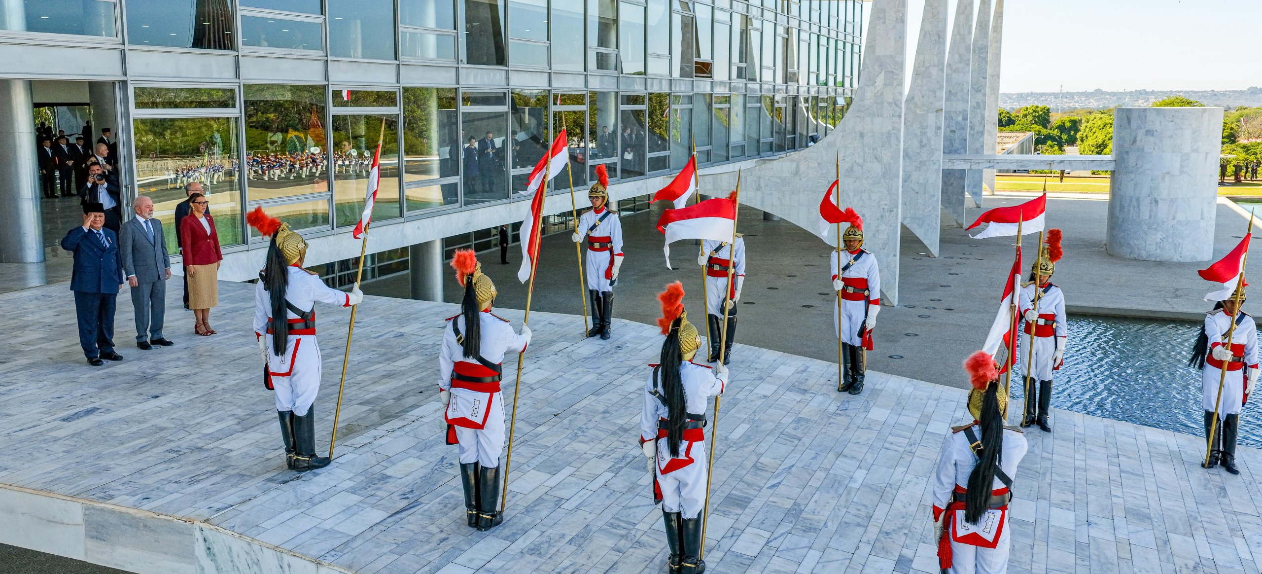 Kunjungan ini semakin berkesan dengan penampilan parade drumband dan Pasukan Berkuda Brasil yang dengan megah mengibarkan bendera Indonesia di balkon istana kepresidenan, yang menciptakan momen simbolis yang mempererat persahabatan antara dua negara anggota G20 dan BRICS.