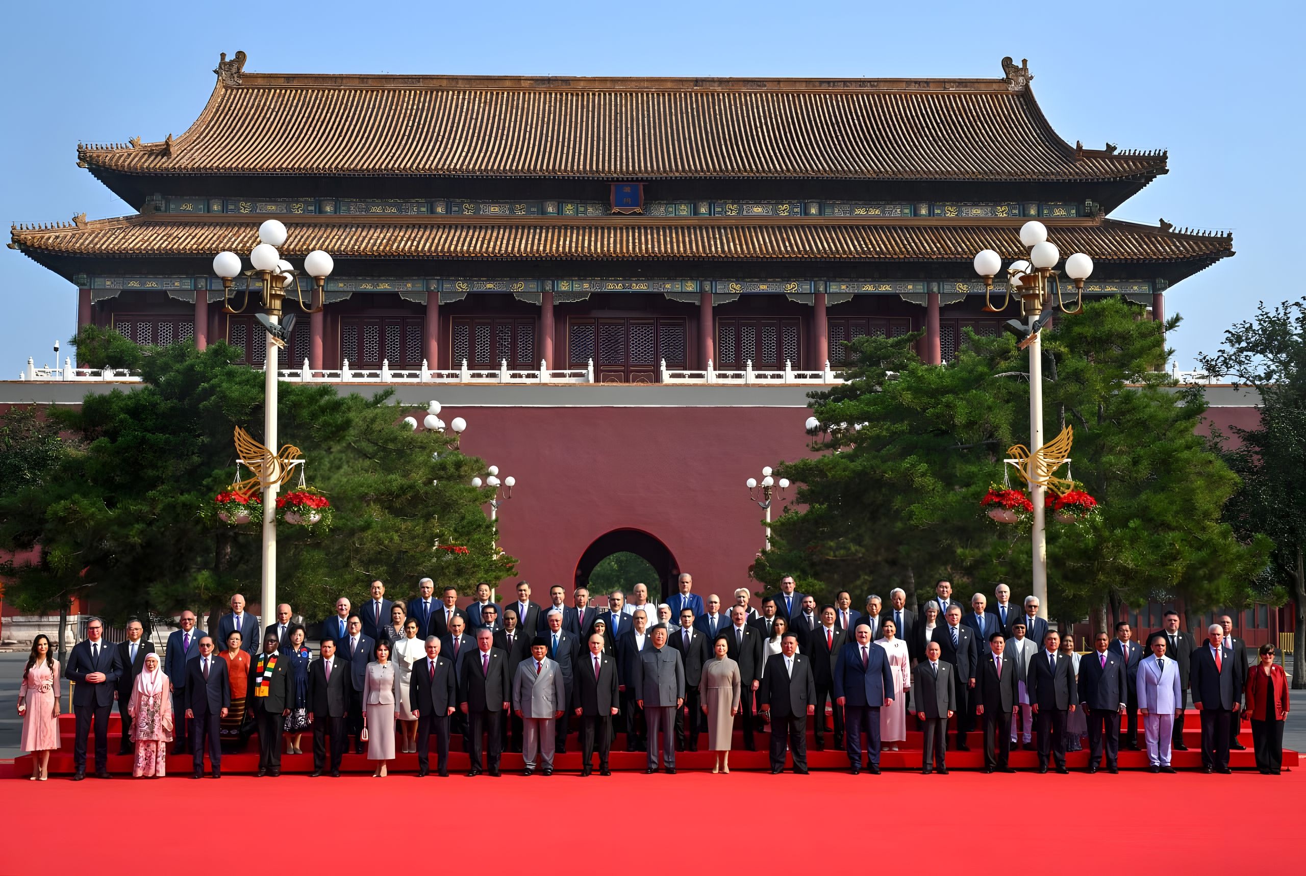 Dalam sesi foto bersama, Prabowo tampak berdiri di sebelah Putin. Usai sesi foto bersama, Prabowo bersama para pemimpin dunia lainnya kemudian bergerak menuju Tian’anmen Rostrum.