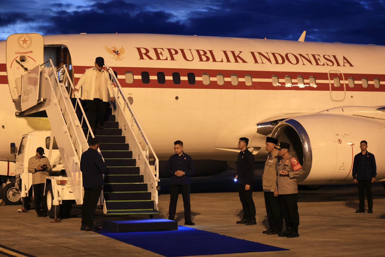 Padang — Presiden Republik Indonesia Prabowo Subianto tiba di Bandara International Minangkabau, Kabupaten Padang, Pariaman, Provinsi Sumatra Barat pada pukul 18:30 wib, Rabu (17/12).